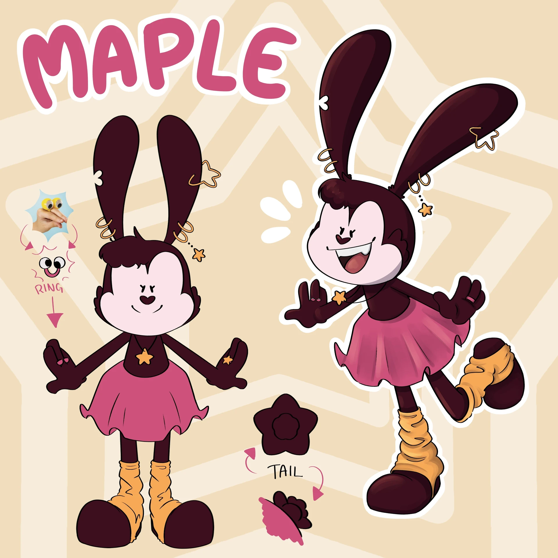 Maple is an energetic and extroverted rabbit toon created for "Project: World of Evil". She is an old childhood friend of the character W.O.E., before they became part animatronic. She plays heavily with classic toon gags, though follows the rule stated in Who Framed Roger Rabbit of "No, not at any time, only when it was funny." She heavily contrasts W.O.E. both through her appearance and personality.